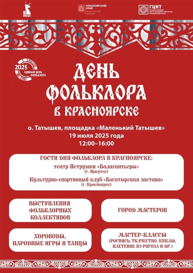День фольклора в Красноярске – праздник народных традиций! 19 июля 2025 года на острове Татышев (площадка «Маленький Татышев») пройдёт яркий и самобытный День фольклора! Гости Дня фольклора в Красноярске: Культурно-спортивный клуб «Богатырская застава» и театр Петрушки «Балагантьеры» из Иркутска. С 12:00 до 16:00 гостей ждет насыщенная программа: 🔺 концерт с участием лучших фольклорных коллективов края 🔺презентация концертной программы «Сибирский календарь – Сибирская вечора» от ансамбля народной песни «Сибирская вечора» Государственного центра народного творчества 🔺 площадка «Богатырская застава»: AR-квесты, стрельба из лука, испытания на основе казачьих традиций и многое другое 🔺 «Город мастеров» – презентация деятельности Домов ремёсел Красноярского края: выставка-продажа изделий и мастер-классы по ткачеству, росписи, валянию и другим ремёслам 🔺 игровые площадки с хороводами, народными танцами и старинными играми для детей и взрослых. 📆 Подробную программу смотрите на фото