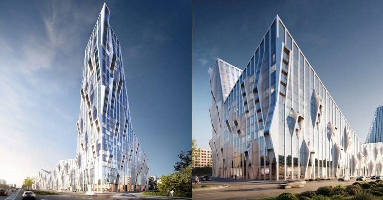 Речь идет об участке бывшей табачной фабрики «Лиггетт-Дукат» на Каширском шоссе, недалеко от станции метро «Домодедовская». Легендарную табачную фабрику перенесли на Каширку в 1999 году, а ранее производство, основанное купцом второй гильдии Ильей Пигитом, располагалось на улице Гашека. Московская фабрика работала вплоть до момента своего закрытия в 2016 году. Впрочем, сейчас к этому участку активно присматриваются девелоперы. Там уже одобрено строительство 123,5 тыс. кв. м недвижимости, из которых почти 70% займет жилье — 86, 4 тыс. кв. м. Интересно, что проект планирует реализовать не московский, а белгородский девелопер — компания «Трансюжстрой». И недавно появился проект будущего жилого комплекса от архитектурного бюро СПИЧ. На представленных рендерах видно, что дом своим фасадом будет напоминать то ли айсберг, то ли огромный кристалл, заостряющийся вверх. Стены оформлены в виде неправильных граней с чередующимися стеклянными и белыми панелями, как будто вся башня вырезана из сверк
