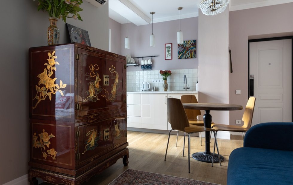 Без дизайнера переделали квартиру в старинном доме в уникальное пространство, которое хочется рассматривать Место: Коломна Метраж: 35 кв. м Год постройки: 1957 Комнаты: 2 Cанузлы: 1 Высота потолков: 2,8 м Дизайн: Арина Олесюк, Олеся Карпова Фотограф и предприниматель Арина Олесюк вместе с сотрудником банка Олесей Карповой сделали ремонт в квартире, которая находится в доме 1957 года постройки. Олеся обустроила пространство для себя, чтобы проводить выходные с друзьями и сдавать его в посуточную аренду. Интерьер получился интересным: в нем соединились элементы купеческого русского стиля, современная мебель и утонченные китайские акценты, придающие всему пространству особую атмосферу. В результате перепланировки в квартире появились две комнаты и ванная с окном. В одной из комнат организовали кухню-гостиную, а во второй — спальню. Такой подход позволил максимально удобно использовать пространство и создать комфортное место для отдыха и общения. Кухня небольшая, в ней предусмотрены только