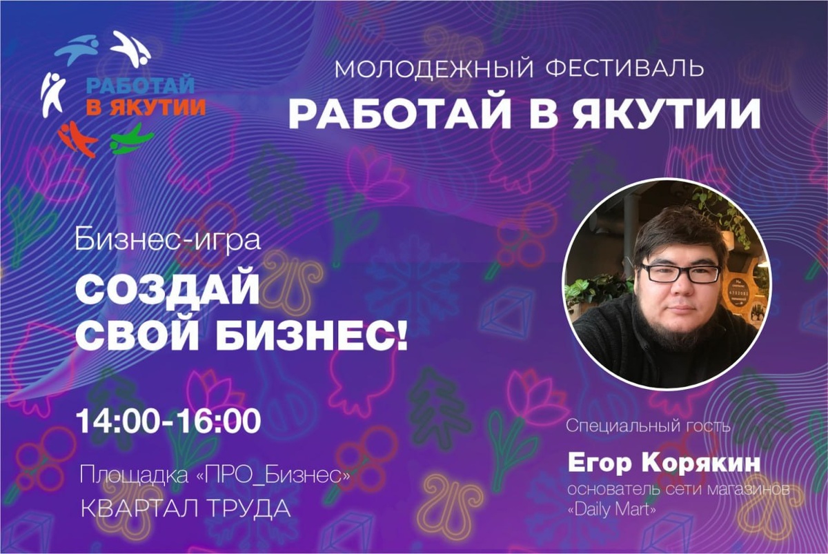 🚀Центр «Мой бизнес» приглашает молодых людей до 35 лет принять участие в увлекательной бизнес-игре «Создай свой бизнес!», которая пройдет на площадке «ПРО_Бизнес» в рамках молодежного фестиваля «Работай в Якутии!». ✔️Это возможность проверить свои предпринимательские навыки, узнать основы создания и развития собственного дела, а также получить ценные советы от экспертов. В ходе игры участники смогут разработать собственную бизнес-идею, спланировать стратегию развития, оценить риски и возможности, а также научиться принимать важные управленческие решения. Преподаватели Центра «Мой бизнес» будут сопровождать участников и предоставлять профессиональные рекомендации. 🌟Особым гостем мероприятия станет предприниматель, основатель сети магазинов «Daily mart» Егор Корякин, который поделится своей историей успеха, вдохновит участников и ответит на все вопросы. 📆Дата: 16 июля ⏰Время: 14.00-16.00 📬Место: г. Якутск, ул. Труда, 1, Квартал труда, зал «Лекторий» 🔗Ссылка для регистрации: https