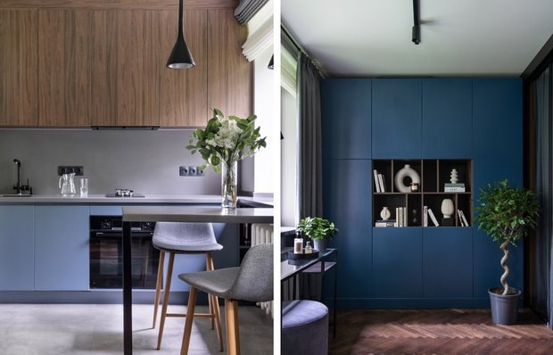Даже при ограниченном бюджете можно создать лаконичный интерьер с характером Квартира расположена в хрущевке в центре Москвы и принадлежит молодой девушке. Интерьер оформляли дизайнеры из Huge Studio: по запросу хозяйки он должен был получиться сдержанным, износостойким и функциональным. Ставку сделали на холодную палитру, встроенную мебель, компактную кухню и грамотное использование каждого сантиметра. Рассказываем, какие приемы заслуживают внимание. Так как заказчица редко готовит, дизайнеры установили плиту с двумя конфорками и встроенную посудомоечную машину шириной 45 см. Холодильник тоже встроен в базу — это позволило сохранить компактность и не перегрузить помещение. Квартира изначально была открытым студийным пространством, но архитекторы решили изолировать спальню. Для этого возвели легкую перегородку, и теперь зона отдыха спрятана от глаз и отделена от кухни-гостиной. Основной упор в мебели сделали на ЛДСП, а не МДФ: так удалось уложиться в бюджет. При этом существующий штучн