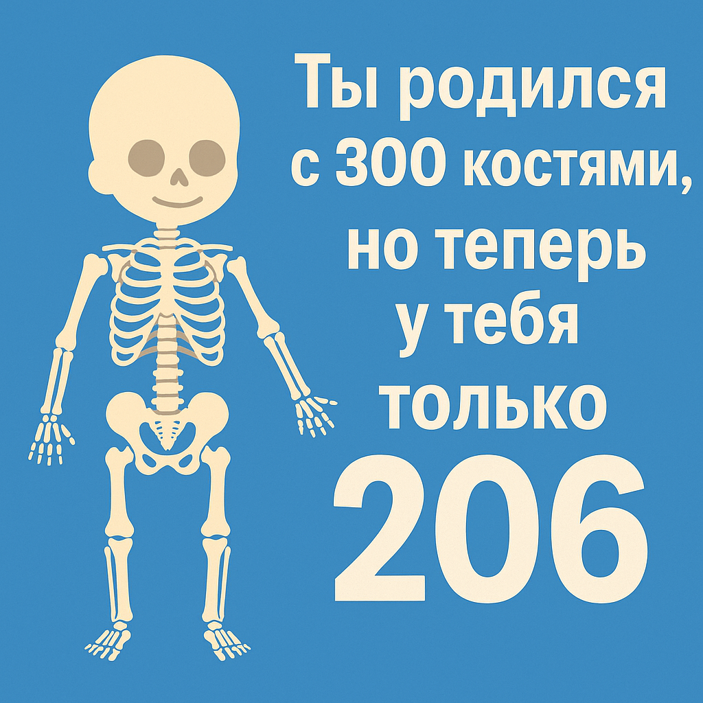 Когда ты появился на свет, в твоём теле было около 300 костей. Но сейчас, став взрослым, у тебя их всего 206.