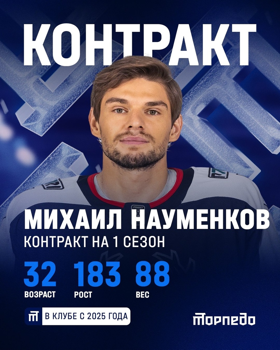↔️Михаил Науменков продолжит карьеру в нижегородском «Торпедо» Михаил Науменков теперь будет играть за "Торпедо"! Нижегородский клуб объявил о подписании однолетнего контракта с защитником. Предыдущие четыре с половиной сезона хоккеист провел в "Салавате Юлаеве". В сезоне 2024/25, 32-летний защитник сыграл 64 матча в регулярке, заработав 23 очка (4 гола + 19 передач). В плей-офф на его счету 19 игр и одна заброшенная шайба. До "Салавата Юлаева" Науменков выступал в КХЛ за "Адмирал" и ЦСКА, где в 2019 году стал обладателем Кубка Гагарина. 📸ХК Торпедо @nhockey