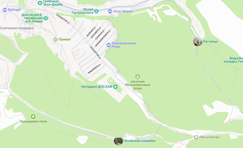 Снизу отмечена «Чеховская скамейка», где мы были в прошлой статье. А справа видно отметку с названием «Лестница». Вот там рядом и находится территория монастыря.
