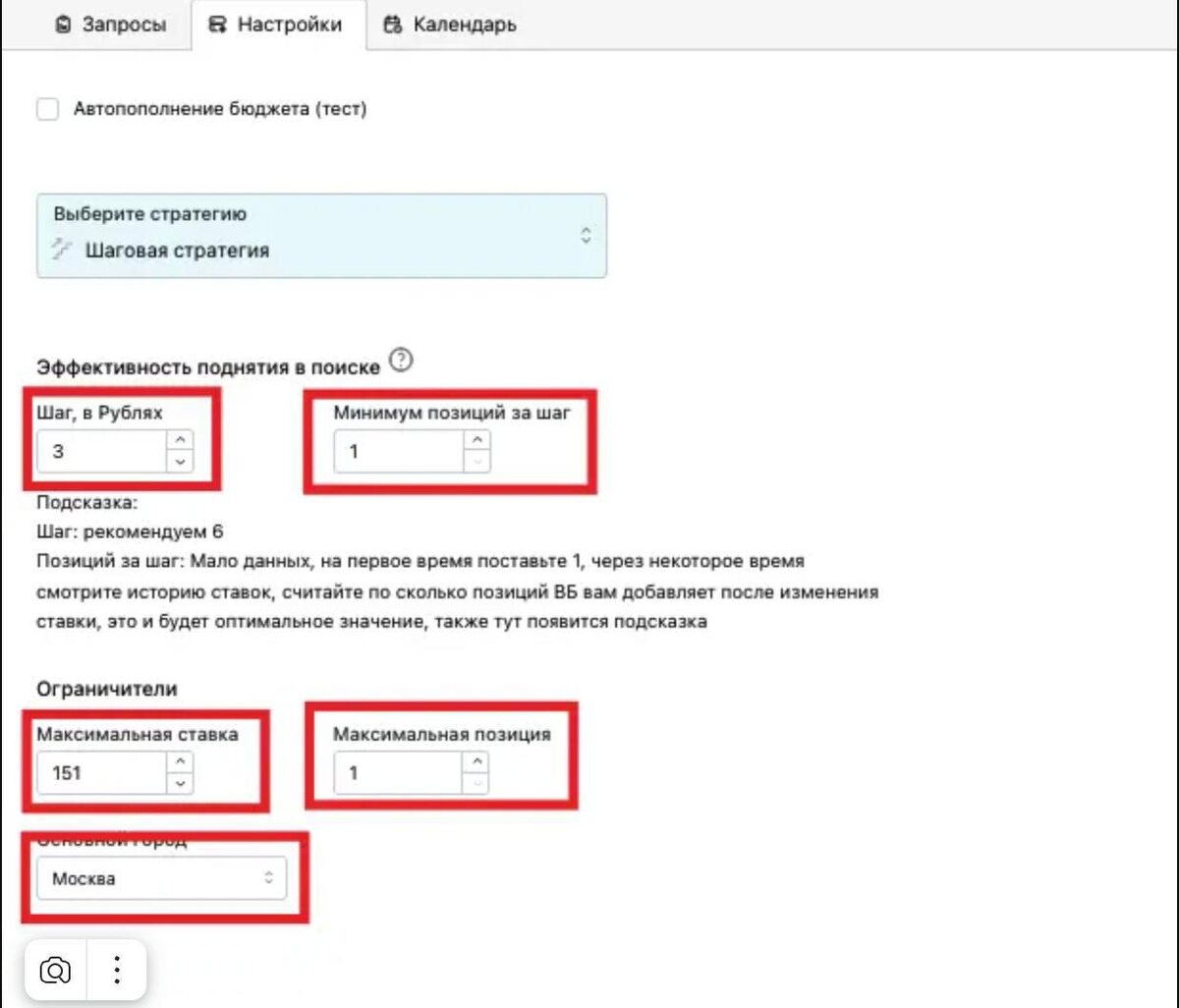 Добрый день, Друзья! Видим, что у нас много новеньких. По этому запускаем серию постов по настройкам стратегии продвижения в WBradar, всего их 5. Сегодня о первой. «Шаговая» стратегия. В настройках стратегии вам необходимо заполнить следующие поля : Шаг, в рублях - на сколько увеличивает ставку бот от той, которая установлена на ВБ Минимум позиций за шаг - на сколько промо позиций должен подняться, за шаг в рублях. Максимальная ставка - ограничивает максимальную ставку для бота. Максимальная позиция - ограничивает максимальную позицию для бота (к ней он стремится, при выставлении шагов) ❓Часто возникающие вопрос. Почему биддер не доходит до максимальной ставки ? - Не хватает размера Шага в рублях. Необходимо увеличить Шаг ставки. Внимание! "Подсказки" - это первичные настройки и после запуска РК вам нужно будет отслеживать, как бот продвигается. Сделать это можно во вкладке "История Ставок", если бот не продвигается по промо позициям и в статусе в истории ставок нет ошибок,