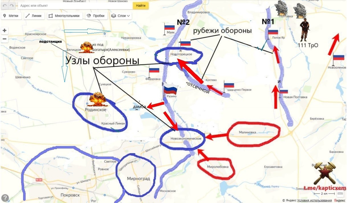 В ответ на пост Восточный охват Покровска. Изоляция поля боя Сегодня ночью дальнобойные реактивные системы "Смерч" отработали по Белицкое и Родинское. С Родинским визуально все понятно, а вот Белицкое как раз на пути потоков материальных ценностей и до некоторых пор, именно там было безопасно их складировать, пока фронт не приблизился. 4 июля была уничтожена Белицкая трансформаторная подстанция 330/110/10 кВ. А вот теперь добрались и до складов и ПВД л\с, уходящих на Маяк и Новоторецкое. схемы и карты