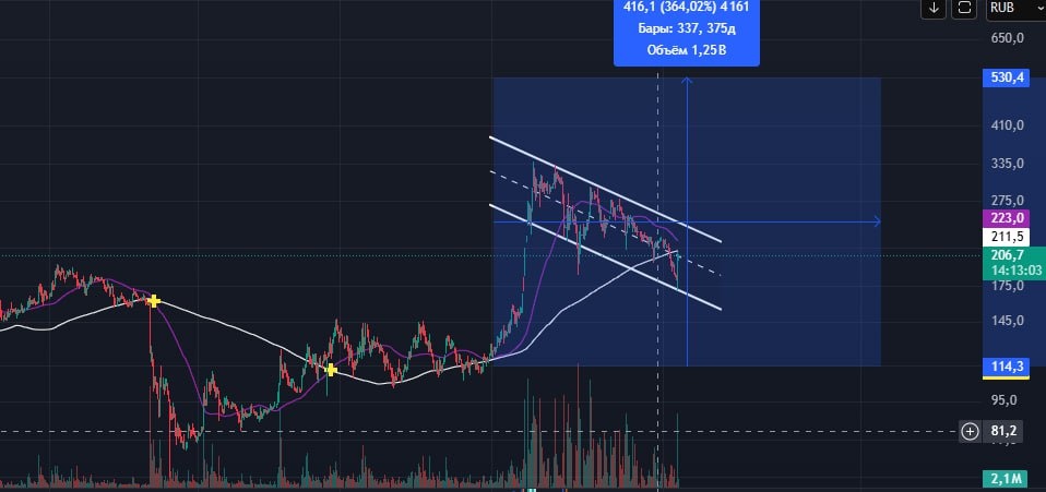 $SPBE Вот предыдущий разбор https://dzen.ru/media/tradinvesti/spbe-685baa52ab70b079d9018160 - как и говорила упали до 170 и развернулись. ✅Стенка канала 240, если пробьет подтвердит флаг и пойдет отрабатывать. 🔼Отработка фигуры до 530. Пока что ровно в канале и ничего не произошло, все идет четко по плану. 🟢Актив, конечно, не самый перспективный, но тем не менее отлично подходит для спекуляций. НЕ ИИР #теханализ #инвестиции #трейдер #спббиржа