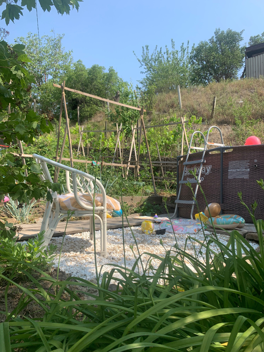 Актуальное в жару - про бассейн. Дачу мы начали приводить в порядок еще в 2016, а вот бассейн - каркасный, поставили в прошлом году только. Не знаю, о чем думали раньше!!!! Как без него жили) Надо было случиться ненормальной жаре, чтоб я решила - бассейну быть и надо думать куда ставить. Тут и проблема - вся без исключений наша дача под уклоном чаще всего градусов 40, дом даже стоит на перепаде высот и свободное место нашлось только на огороде. В итоге моя дочь взялась за лопату и выкопала малину, которую и так убирать надо было на новое место. Выровняла плошадку, пригодился наконец то плоский шифер из 80-х, потом я купила утеплитель, линолеум и наконец-то бассейн поставлен.. ну, не с первого раза, со второго .. земля подсела, через неделю дочь смотрела- смотрела и решила переделать. Сейчас красота!!!! Фильтр пока не покупали, для чистоты используем перекись. Не скажу, что меня устраивает, но в июле почему то без перекиси, на медленном хлоре, вода резко за сутки зацветает и приходит