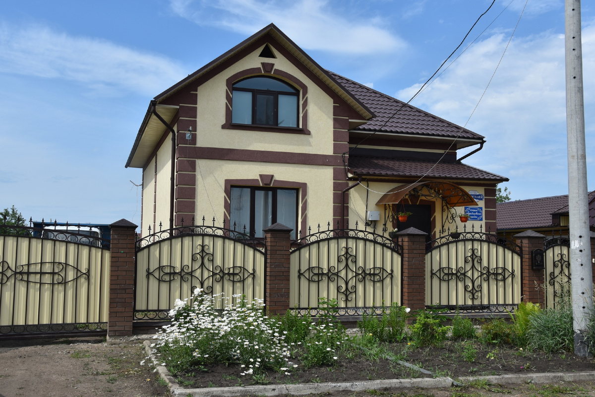 Перед усадьбой небольшая клумба. Слегка покачиваясь на ветру, прохожих приветствует дружная семейка ромашек. Невысокий забор из профлиста и кирпича украшен коваными металлическими завитками, пиками. За ним хорошо виден аккуратный двухэтажный дом, где светло-жёлтую побелку оттеняет рельефная кладка шоколадного цвета. На подоконниках с внешней стороны, под навесом кашпо с яркими петуньями. Так и просится сравнение – настоящий теремок. Мне удалось пообщаться с хозяином Юрием Леонидовичем Ильющенко. 37 лет он работает на железной дороге, последние 19 – вагонником. Жена Лидия Николаевна трудится в жилищно-коммунальном хозяйстве. Казалось бы, их профессии далеки от лирики, но душа стремится к прекрасному. Много лет Ильющенко использовали этот участок под огород. Позже начали строиться. Юрий Леонидович честно признаётся, что сам он класть кирпич, пилить, строгать не умеет, нанимал рабочих. Тем не менее эскизы, цветовое решение, разбивку участка продумывали вместе с женой. Можно было бы и не в