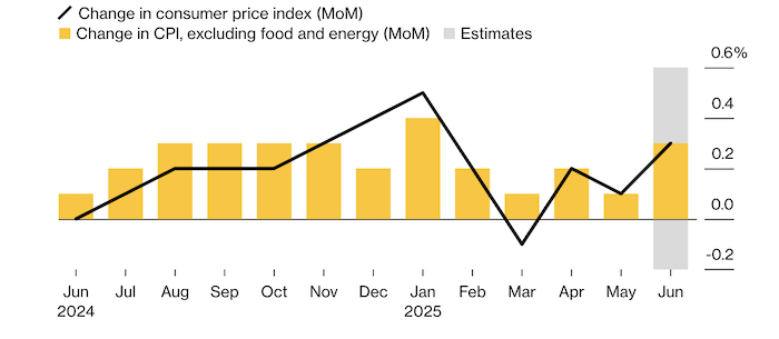 Экономисты давно предупреждали о том, что тарифы будут толкать инфляцию вверх. Сегодняшний отчет по потребительским ценам подтвердит или опровергнет это предположение Прогнозы по инфляции в США. Источник: Bloomberg После четырех месяцев переоценки показаний индекса потребительских цен прогнозисты предсказывают разгон инфляции. Рост в категориях, подверженных тарифам, включая мебель, игрушки и товары для отдыха, а также автомобили, может положить конец череде мягких цифр. Федеральная резервная система оказалась в сложной ситуации: в этом году регулятор держал процентные ставки без изменений, опасаясь тарифной инфляции, которая пока не проявилась. Еще один спокойный показатель почти наверняка еще сильнее разгневает президента Дональда Трампа, который неоднократно призывал центральный банк снизить ставки и лично критиковал председателя Джерома Пауэлла. Существует широкий консенсус среди чиновников ФРС и прогнозистов частного сектора, что инфляция вырастет летом, когда предприятия начнут п
