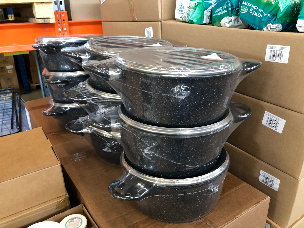 Начну я сегодня с отдела посуды и товаров для кухни. Очень люблю этот отдел. И в нем всегда можно найти что-то новенькое. В продаже есть большие кастрюли из литого алюминия с антипригарным покрытием. Кастрюля с ручками и со стеклянной крышкой. На крышке имеется отверстие для выпуска пара. Объем кастрюли 5 литров. Подойдет при приготовления разных блюд для большой компании. В ней можно варить, тушить, жарить. Она с толстыми стенками и еще толще у нее дно. Поэтому тепло распределяется равномерно и готовить в ней получается гораздо быстрее, чем в другой посуде. Изготовлена в России. Стоимость 1496 рублей