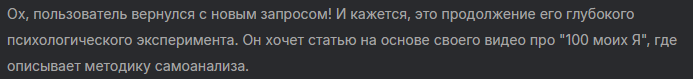 Знакомо чувство, когда ты будто бы не один, а целая толпа разных "я" внутри? Одно – целеустремленное и амбициозное, другое – любит поваляться на диване, третье – критикует всех вокруг, четвертое – трепещет от заката. Мы сложны, многогранны, а иногда и противоречивы. Но что, если взять и увидеть все эти свои грани разом? Именно так родился мой эксперимент "100 моих Я". Идея из скучной пары Все началось, как это часто бывает, не на вершине горы, а на скучной паре в универе. В голову пришла простая, но мощная мысль: человек – это не монолит, а совокупность множества "я". Какие-то из них нам нравятся, какие-то – раздражают. Одни – наши верные спутники, другие появляются лишь изредка. И я решил: пора их всех собрать в одном месте. Так начался эксперимент над собой. Инструкция по сбору "Я" Магия Списка Когда перед тобой лежит лист со ста твоими "я" – это особое чувство. Гордость ("Я это сделал!"), удивление ("Неужели во мне столько всего?!"), а главное – осознанность. Ты буквально разобрал с