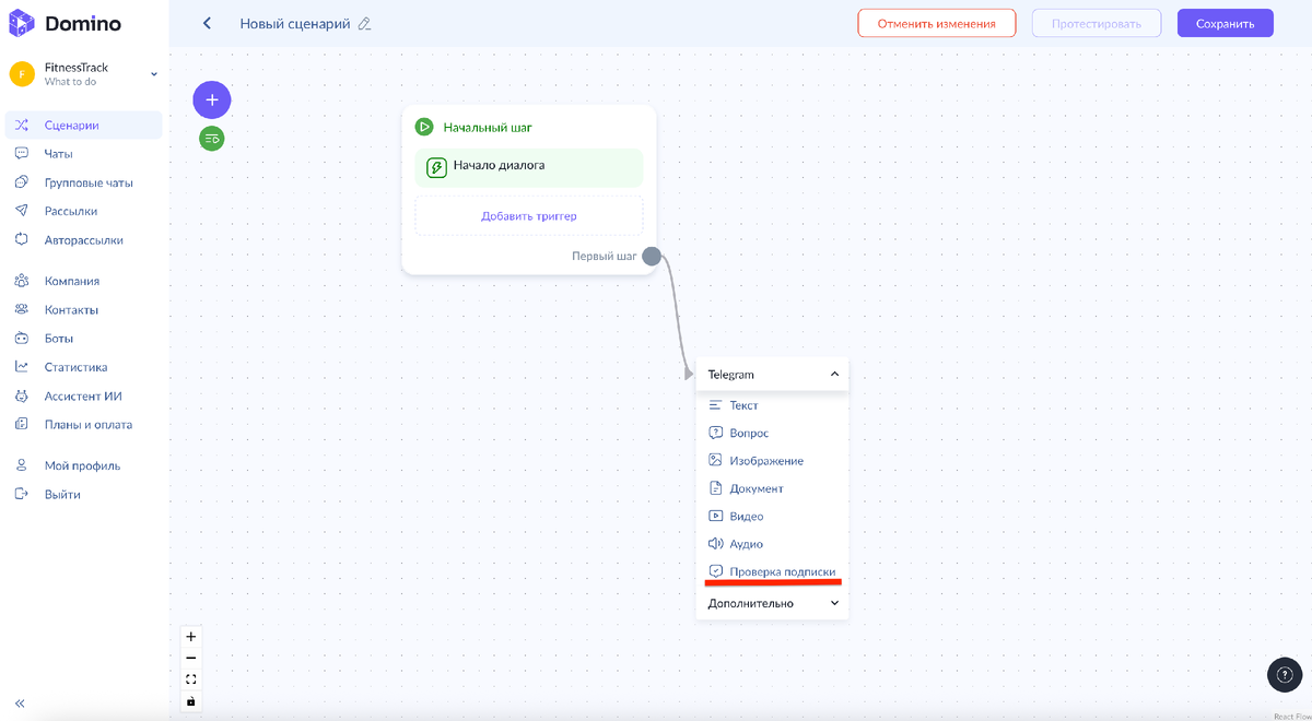 Если ваша цель — привлечь дополнительных подписчиков в свой Telegram-канал и тем или иным образом дать им причину остаться, то конструктор Domino CRM предлагает вам под это особый блок в сценарий чат-бота. Он называется “Проверка подписки” и позволяет: Это крайне удобно, если ваша маркетинговая стратегия в Telegram предполагает: 1. В сценарии ставите блок “Проверка подписки”. 2. Добавляете описание и картинку, а потом прописываете CTA на кнопке. 3. Потом — указываете канал, на который должна быть проверка. Бот умеет проверять сразу несколько каналов. Главное, дать ему права админа. Domino CRM позволяет сделать три ветки: