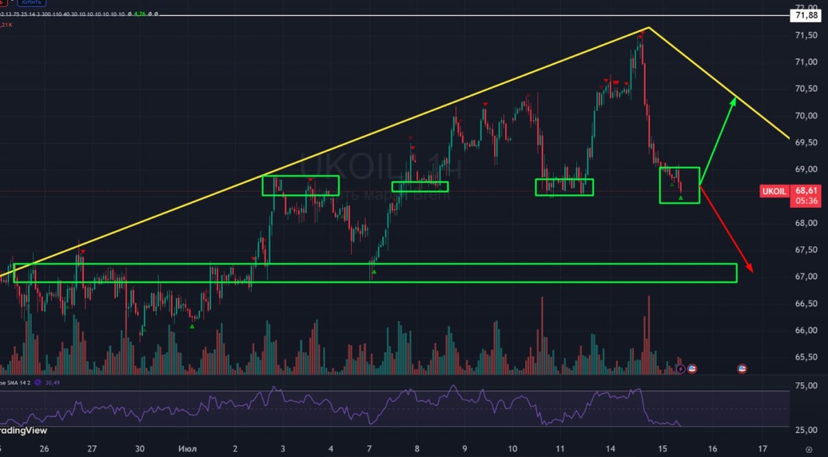 В ответ на пост 🛢 #Нефть #Brent #BR #bogdanoffinvest 🟢 Вчера писал про слом конвергенции по нефти. Сегодня уже направляемся вниз. Прямо сейчас проходим по локальной поддержке. Если пробьем текущий уровень, то следующая поддержка на 67$, В случае отскока еще раз двинем на 71.88. 🚗 В целом, я жду нефть вниз. Американцам нужна дешевая нефть, и, скорее всего, они ее получат. Снижение цены на нефть при текущем курсе рубля - это негатив для бюджета и для рынка в целом.