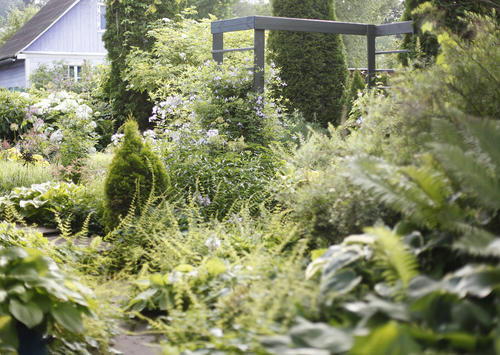 Заглянем в сад за домом. На перголе цветут клематис Бетти Корнинг и молочноцветковый колокольчик. Клематис и колокольчики прелестны. Цвет колокольчика очень светлый розовый, часто он кажется почти белым на фото. Вид в обратную сторону. Через сад вдоль этого цветника идет деревянная дорожка. Вдоль нее хосты, астильбы, осока пальмолистная и лилии, отцветшие луки и зацветающие гортензии. Осока пальмолистная идеально скрывает пожухлые листья луков и остатки лилий. В этой части сада две больших хосты Sun Power, они ярко-желтые и всегда перетягивают внимание на себя, так что на фото я их редко помещаю, ну или только если их лично фотографирую. За перголой - цветник у забора. Там весной и в начале лета цветут рододендроны, а сейчас мелколистная спирея японская, древовидная гортензия, астильбы... Слева направо. Вот вроде и все...