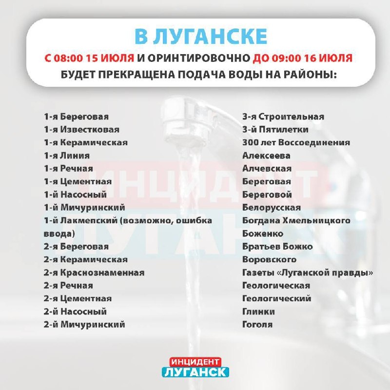 💦С 15 по 16 июля в городе будет масштабное отключение воды В этих числах будет ремонт на электроподстанциях. Адреса, где будут отключения, в карточках☝🏻 Информацию по вашему району можете уточнить у диспетчера Луганскводы по номерам: ▪️+79591121050 ▪️+79591131050 Источник: Инцидент Луганск. ————— Поддержите канал Подпиской на "Сыны Отечества" или Голосом за канал ✅ подписаться |⚡️проголосовать 📲Наш проект в социальных сетях: Вконтакте, Одноклассники, Дзен, RuTube
