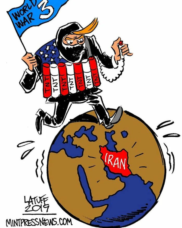 Война с Ираном для США — тема вечная, с 1979 года. Это рисунок Карлоса Латуффа, изображающий Трампа в походе на Иран, размахивающего флажком 3-й Мировой войны и обвязанного «поясом шахида», ещё 2019 года