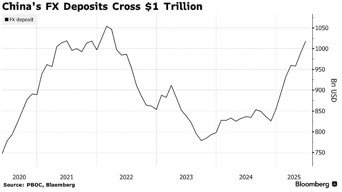 Накопление иностранных депозитов отражает снижение доверия к экономике и ожидания дальнейшего ослабления китайской валюты В прошлом месяце китайские компании и частные лица значительно увеличили свои валютные активы, поскольку они предпочитали хранить деньги в иностранной валюте, а не в юанях. Это было связано с тем, что они ожидали дальнейшего снижения процентных ставок в Китае. Согласно данным, опубликованным Народным банком Китая в понедельник, в июне общий объём валютных депозитов в Китае достиг рекордного уровня с марта 2022 года и составил 1,02 трлн долларов США. За первое полугодие этот показатель вырос на 165,5 млрд долларов США, что является самым значительным ростом с 2005 года. Накопление валютных депозитов отражает снижение доверия к экономике и ожидание дальнейшего ослабления национальной валюты, несмотря на то, что доллар укрепляется из-за политики президента Трампа. Валютные депозиты Китая превысили 1 триллион долларов. Валютный депозит, млрд долларов США. Источник: Наро