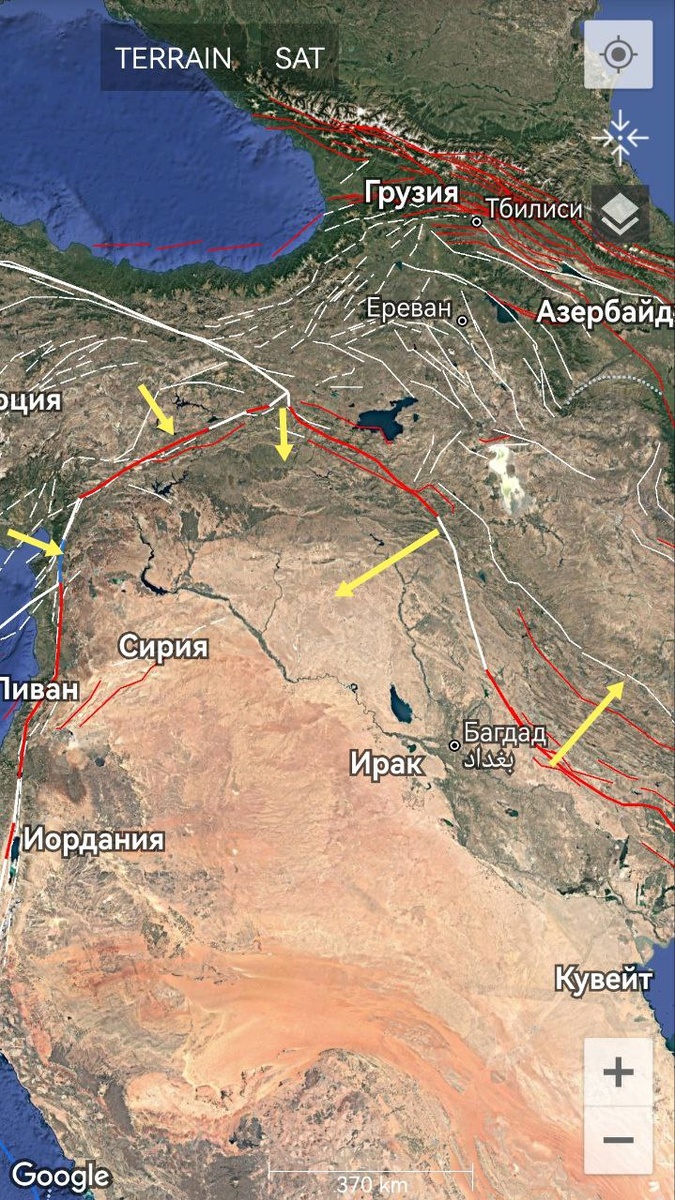 По северу Аравийской плиты сформировались несколько ОСТИ. Пока не ясно, как их интерпретировать - в качестве единой системы или по отдельности. Наиболее четко трассируется северо-западная граница плиты, а по северо-восточной границе похоже на отклонение и смещение индикаторов от рифтовой зоны в сторону Ирака (против часовой стрелки). Данный деформированный участок на обрамлении Аравийской плиты (граница Ирака и Ирана, а также северо-западный Иран) находится под наибольшим подозрением относительно возможного эпицентра. Как бы то ни было, есть вероятность землетрясения М5-6+ на всем протяжении ОСТИ. А если же рассматривать ситуацию как единую систему, то и до М7+, а точнее - до M7.4+/-0.2 по формуле протяженность дотягивает. Вероятность сильного землетрясения на северном обрамлении Аравийской плиты имеется в течение 9 дней. ==== Several CSTIs have formed along the north of the Arabian Plate. It is not yet clear how to interpret CSTIs - as a single system or separately. The northwester