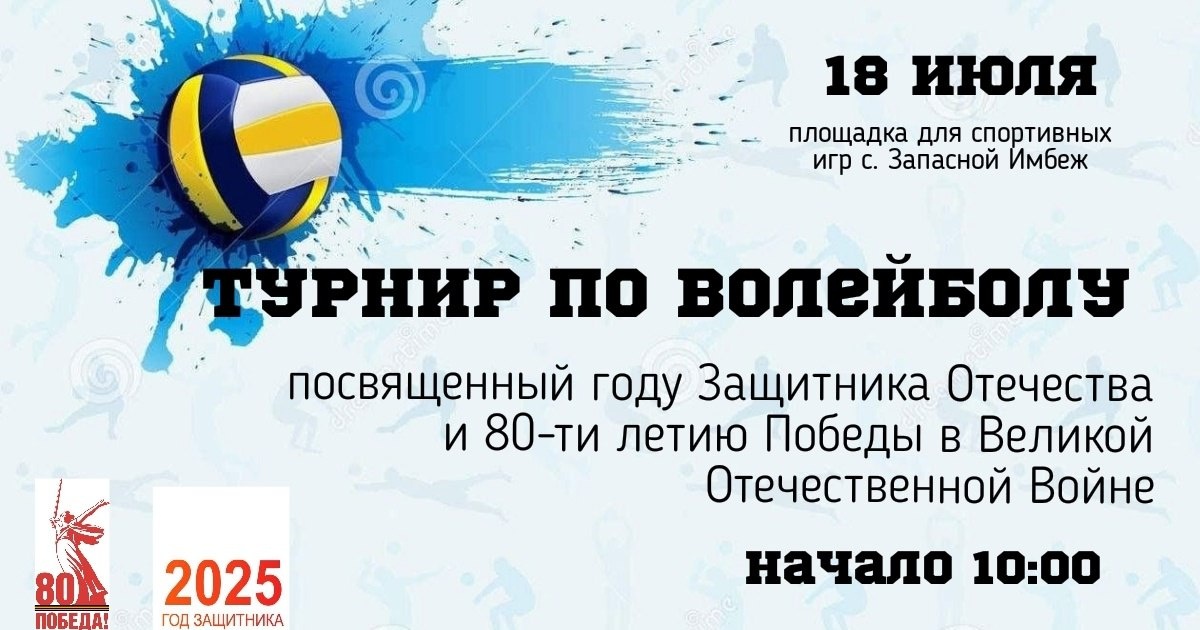 Турнир по волейболу в селе Запасной Имбеж 18 июля на местной спортивной площадке состоится волейбольный турнир. Мероприятие посвящено двум важным датам: Году защитника Отечества и 80-летию Победы в Великой Отечественной войне. Начало соревнований в 10:00.