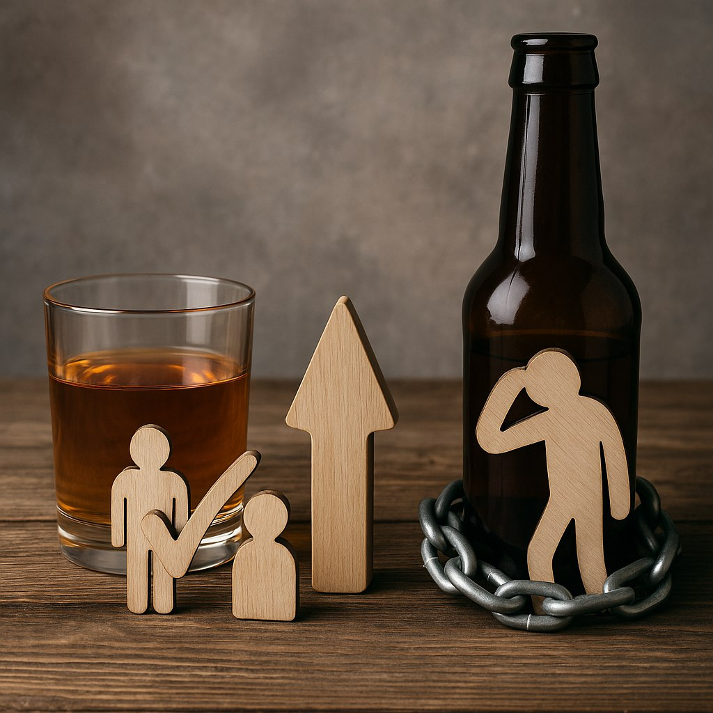 Алкоголь — неотъемлемая часть культуры многих народов. Его употребляют в праздники, на встречах с друзьями, для снятия стресса. Однако между умеренным употреблением и развитием зависимости проходит тонкая грань, которую легко переступить. В этой статье мы разберём: - Как алкоголь влияет на организм. - Что считается безопасной дозой. - Как формируется зависимость. - Какие признаки указывают на проблему. - Как сохранить контроль над употреблением. 1. Алкоголь и его влияние на организм 1.1. Краткосрочные эффекты После употребления алкоголь быстро всасывается в кровь и воздействует на центральную нервную систему: - Легкое опьянение (0,2–0,5‰) – расслабление, улучшение настроения. - Средняя степень (0,6–1,5‰) – нарушение координации, замедление реакций. - Сильное опьянение (1,6–3,0‰) – спутанность сознания, тошнота, риск отравления. - Критическая доза (более 3,0‰) – угнетение дыхания, риск комы и смерти. 1.2. Долгосрочные последствия Регулярное употребление алкоголя приводит к: - Печень: ж