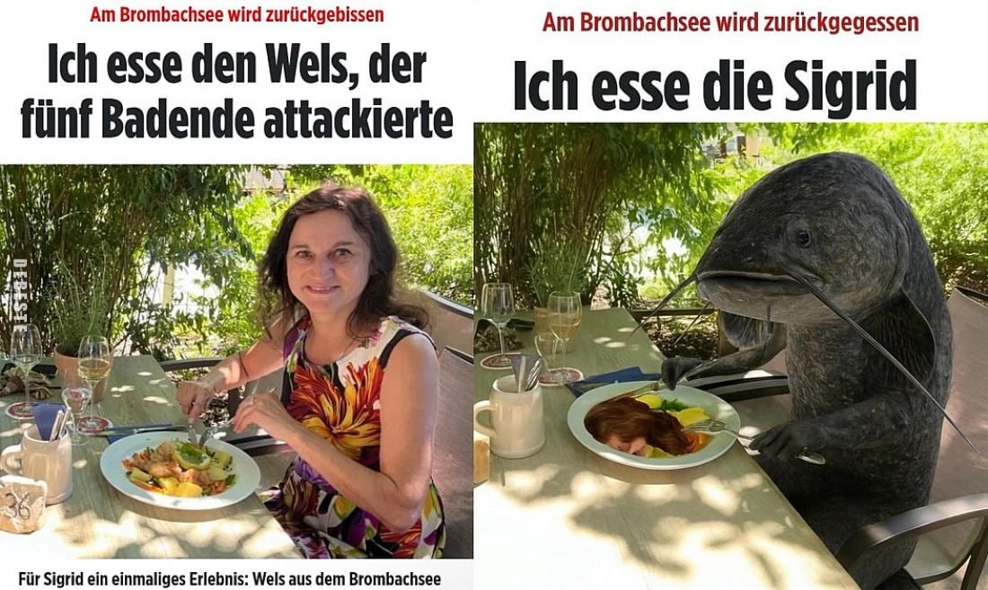 Der Dritte Welskrieg 🎣 Шумиха в немецких СМИ и соцсетях всё не утихает, но если она прошла мимо вас, мы спешим на помощь! Итак, почему главной рыбой этого лета стал der Wels (сом)? 1⃣ На Brombachsee произошла трагедия: 90-килограммовый сом покусал купающихся людей 2️⃣ Подоспевший на место происшествия полицейский застрелил сома тремя выстрелами А сейчас вот СМИ всё же пишут, что не застрелил, а оглушил, ведь пули под водой не столь эффективны. Добили бедолагу сома рыбаки. Причём – цитата – "fischereikonform" (в соответствии с правилами рыбалки). 3️⃣ Организации по защите животных и простые немцы подняли шум: ведь у сомов как раз сейчас нерест (die Laichzeit), и папа-сом защищал своё гнездо и маленьких сомят от людей! Обычно сомы до пляжей не доплывают и людей не атакуют, но тут сложились факторы: слишком жаркое лето (привет, глобальное потепление!) и слишком малое количество осадков – соответственно, сомы релоцировались и оказались в непосредственной близости к людям. А ещё люди в