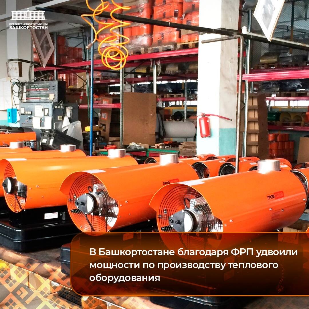 В Башкортостане благодаря ФРП удвоили мощности по производству теплового оборудования ➡️ «Белорецкий завод теплового оборудования» модернизировал производство и удвоил мощности по выпуску электрических тепловентиляторов, дизельных и газовых теплогенераторов — до 55 тысяч единиц в год. Инвестиции в расширение производства составили 77 млн рублей. ✔️ За счет расширения производства «БЗТО» намерен нарастить свою долю с 5% до 10%, частично заместив зарубежные аналоги. Локализация производства продукции составляет 95%. — Тепловые пушки являются востребованными на рынке Российской Федерации. Уход западных производителей с российского рынка создал уникальную возможность для отечественных производителей теплового оборудования. Тепловые пушки Белорецкого завода теплового оборудования стали особенно востребованы в условиях импортозамещения, и мы наблюдаем значительный рост интереса к высококачественной продукции республиканского изготовителя как со стороны российских строительных компаний, та