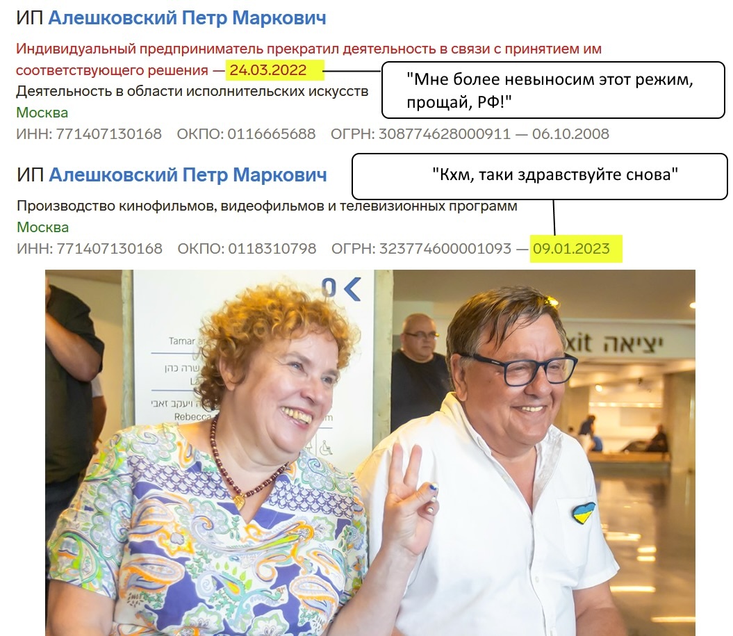 Так что летом 2022 года писатель Пётр Алешковский презентовал книгу, оплаченную Невзлиным, откровенного спонсора нацистов из ВСУ. А уже в начале 2023 года господин Алешковский, видимо, проев-пропив все невзлинские гонорары, заскучал по столь ненавидимой им Родине. Вернее, заскучал он по российским финансовым возможностям. Россия, как известно, щедрая душа. Алешковский вернулся и зарегистрировал очередное ИП.
