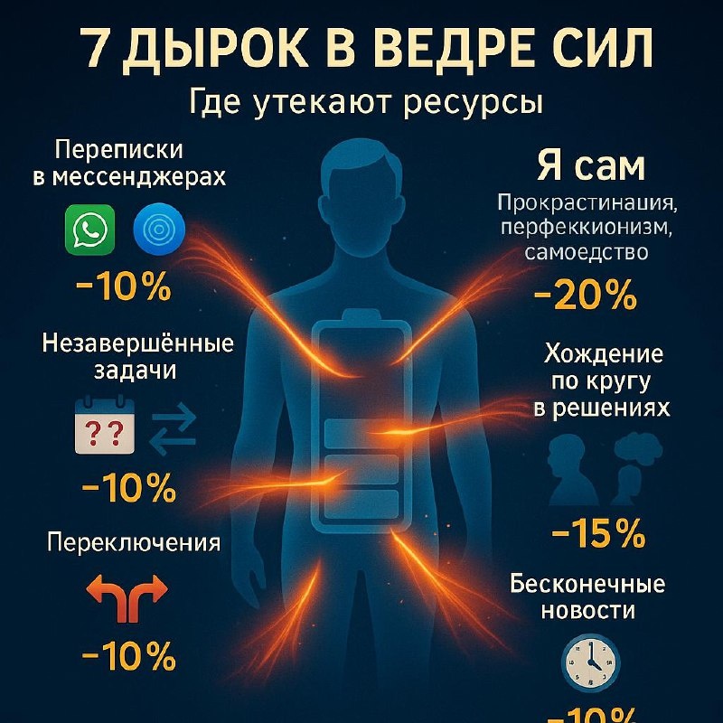 Кто и что высасывает мои силы (честный список) 🧛♂️ После вчерашнего поста про сбой в системе задумался: а что именно отнимает у меня больше всего сил? Составил честный список. Некоторые пункты удивили даже меня! 😅 🧛♂️ МОИ ВАМПИРЫ СИЛ: 1. Переписки в мессенджерах WhatsApp, Telegram — бесконечные уведомления. Отвечаю на одно, приходят ещё три. К вечеру чувствую себя белкой в колесе переписок. 2. Социальные сети Зашёл "проверить одно сообщение" — вынырнул через час. Лента засасывает как болото. Мозг после этого как вата. 3. Незавершённые задачи Начал 5 проектов, ни один не довёл до конца. Они висят в голове постоянным фоном и тихо жрут ресурсы. 4. Переключения между задачами Пишу текст → звонок → почта → снова текст. Каждое переключение "съедает" 15 минут на втягивание. 5. Бесконечные новости Проверил сводку — час читаю обсуждения в комментариях. Информационная перегрузка без практической пользы. 6. Хождение по кругу в решениях Одну задачу обдумываю по 3 дня. Варианты в голо