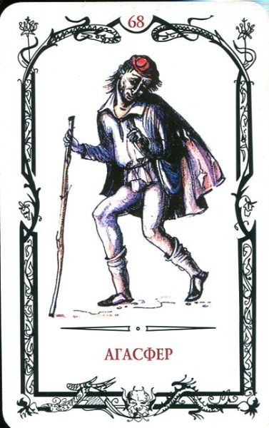 Агасфер это карта колоды, означает обман, попытки скрыть правду, стремление вызвать доверие. В этой карте заключён образ замкнутого цикла: человек постоянно совершает ошибки, и за это его настигает возмездие. Однако вместо того, чтобы извлечь урок, он вновь оступается и расплачивается за это. И так будет продолжаться до тех пор, пока он не поймёт свою беспомощность перед Судьбой. На карте изображён коварный человек с изворотливым нравом. Он служит сильным, но при этом притесняет слабых, стремясь подняться за их счёт и окунуть других в пучину порока. Агасфер демонстрирует мужчину, который не может устоять перед женскими чарами. Он любитель флирта и лёгких отношений. Этот человек не отличается стабильностью и надёжностью в любовных отношениях. Он не проявляет свои чувства открыто и сопротивляется им. В контексте отношений с троллями Агасфер показывает бывшего партнёра, который может стать источником проблем в будущем. В психологическом плане мужчина будет стремиться к идеальной любви. Ж
