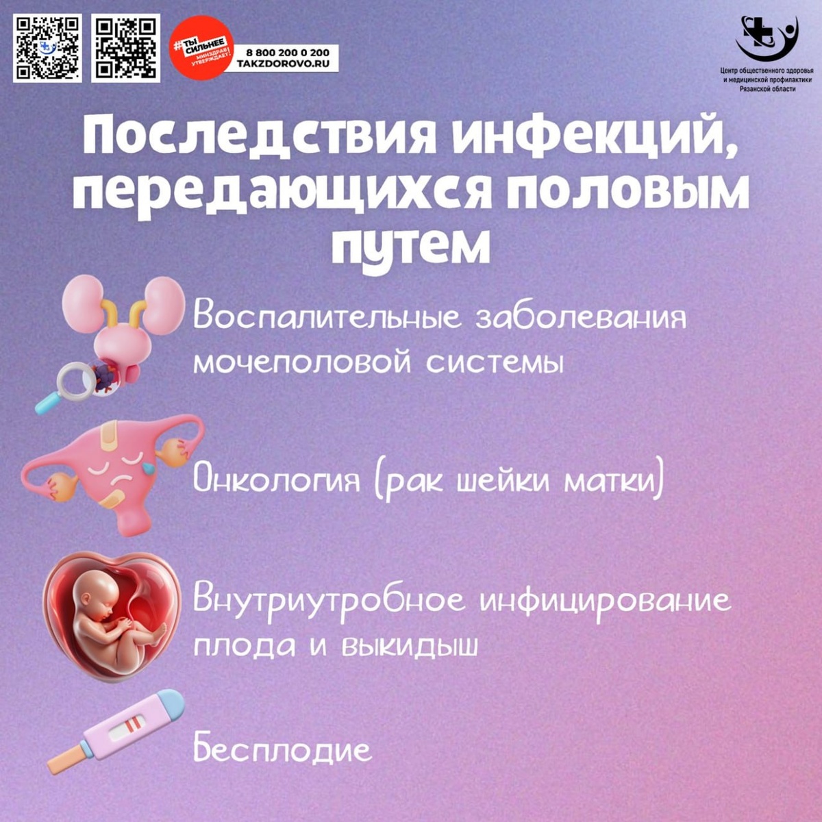 🔔 Началась Неделя профилактики ИППП! Чем опасны инфекции, передающиеся половым путем? Последствия ИППП могут быть серьезнее, чем вы думаете: ⚠ Основные осложнения: 🔹 Бесплодие (хламидиоз, гонорея повреждают репродуктивные органы) 🔹 Хронические воспаления (простатит, цистит, эндометрит) 🔹 Внематочная беременность (из-за спаек после инфекций) 🔹 Рак (ВПЧ вызывает рак шейки матки, горла, прямой кишки) 🔹 Поражения суставов, сердца, нервной системы (поздние стадии сифилиса) 🔹 Преждевременные роды, заражение плода (при беременности) 💡 Как избежать последствий? ✔ Регулярные анализы (раз в 6-12 месяцев) ✔ Половые контакты только с барьерной защитой ✔ Срочное обращение к врачу при симптомах ✔ Лечение обоих партнеров одновременно ❗ Помните: Многие ИППП сначала протекают бессимптомно, но продолжают разрушать организм! #СтопИППП #ПоследствияИППП #ПроверьСебя #Здоровоебудущее62 #ЗдороваяРязань Здоровье вашей семьи начинается с вашей ответственности!