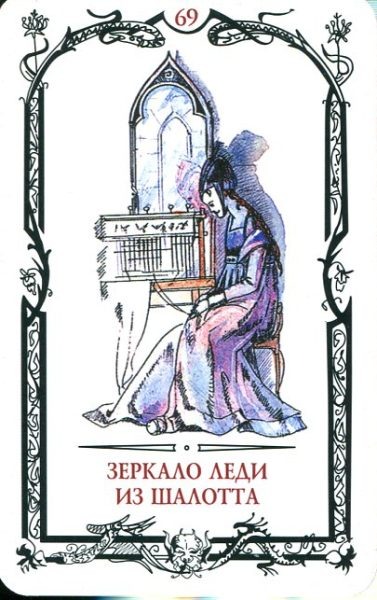 Зеркало леди из Шалотта это карта колоды, означает грусть, заточение, одиночество. На карте изображён пожилой человек, который наблюдает за влюблённой парой. Это женщина, которая находится в заточении и испытывает дефицит любви, заботы и нежности. Эта карта олицетворяет одиночество, добровольное заточение и семейные неурядицы. Одинокий, без близких людей, без любви и хобби. С непростым нравом и оригинальным мировоззрением. Это личность с повышенной чувствительностью и высокими ожиданиями от себя и окружающего мира. Отношения, которые развиваются в виртуальном пространстве (через интернет или телефон), на расстоянии. Знакомство и общение через интернет, в социальных сетях. В контексте «что связывает партнёров» может указывать на общение через интернет. Также может подразумевать отдалённость и изолированность от женщины. Затаённая соперница, которая умеет ждать и предпринимает какие-либо действия в отношении объекта. Чаще всего она выступает в роли серого кардинала, которого не принимаю