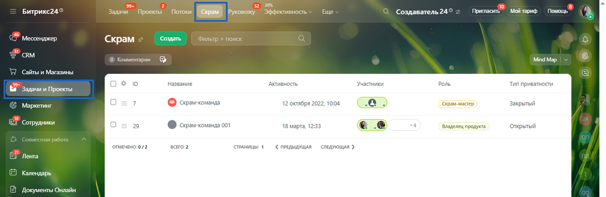 Скрам-команды в Битрикс24 — это удобный способ организовать гибкую и прозрачную работу над проектами. Методология Scrum помогает командам работать итеративно: с короткими спринтами, регулярными встречами и понятной структурой задач. В этой статье расскажем, как найти раздел Скрам, создать команду, настроить роли, встречи и задачи. Материал основан на 12 уроке из Полного курса по Битрикс24 – Скрам. Скрам помогает быстро запускать проекты, фокусироваться на ценности для клиента, улучшать командную коммуникацию и сокращать время на выполнение задач. Особенно полезен будет скрам в маркетинге, IT, продажах и других сферах, где важно быстро реагировать на изменения. Перейдите в раздел «Задачи и проекты» в левом меню. В верхней части интерфейса выберите вкладку Скрам. Дальше у вас два варианта: При создании команды вы сможете: После создания вы настраиваете состав команды: В Скрам важны регулярные встречи — в Битрикс24 они настраиваются через раздел «Чаты и встречи». Вот основные типы встреч: