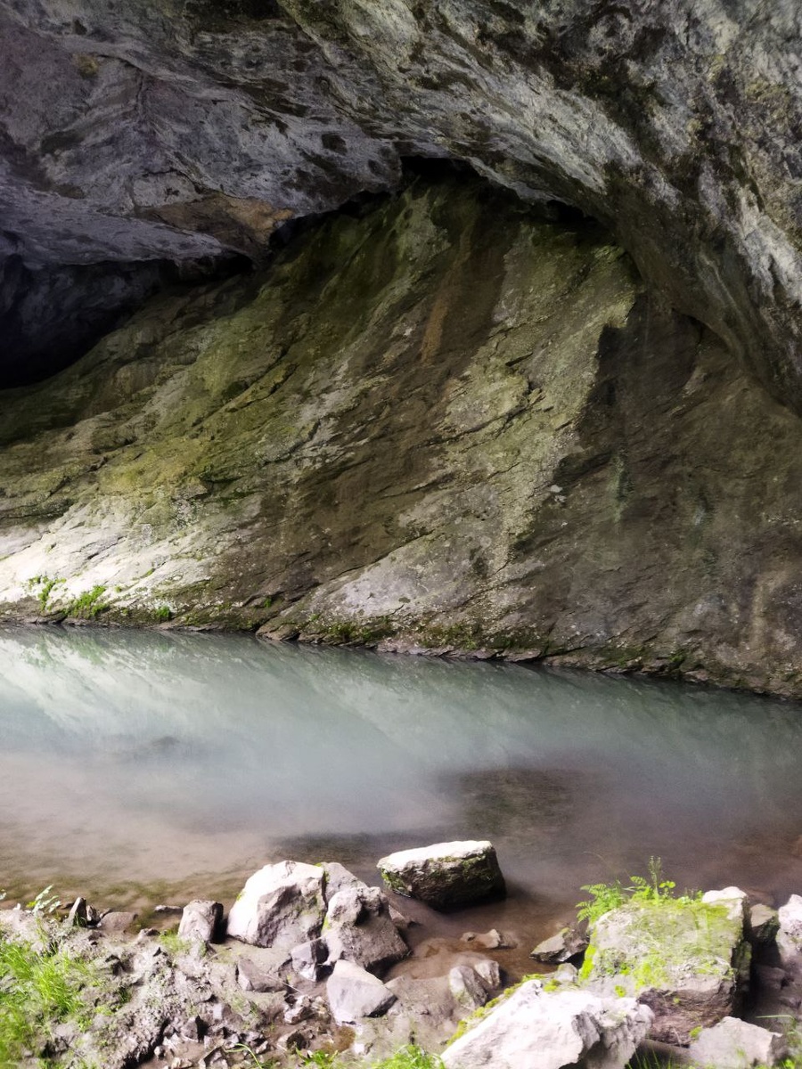 Возле входа в пещеру расположено знаменитое Голубое озеро. Небольшое – всего три метра в длину, но очень глубокое – более восьмидесяти метров. Глядя на водную гладь, отливающую бирюзой, вспомнила интернетную «мульку» о том, что в народе это озеро считается источником живой воды, поэтому многие туристы стремятся попить из него и набрать воды в дорогу. Но делать этого не стоит, так как согласно тому же интернету, из-за высокого содержания минеральных солей вода в озере непригодна для питья, но вполне подходит для оздоровительных и косметических ванн. Правда, купаться в нём запрещено, чтобы не нарушить и без того хрупкую экологию внутри пещеры.