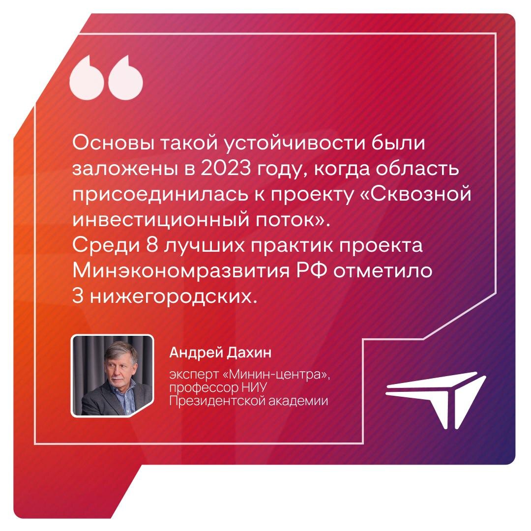 В 2021 году Нижегородская область вошла в пилотный проект по внедрению регионального инвестиционного стандарта и в рейтинге 2023 года уже занимала вторую строчку после Москвы. В этом году область снова подтвердила реализацию регионального инвестстандарта на высшем уровне. Эксперт «Минин-центра» и профессор НИУ Президентской академии Андрей Дахин рассказал, что стоит за устойчивым вторым местом и как Нижегородская область выстраивает системную политику в сфере инвестклимата. «Основы такой устойчивости были заложены в 2023 году, когда область присоединилась к проекту "Сквозной инвестиционный поток". Цель проекта в том, чтобы сократить сроки получения разрешительной документации и количество запрашиваемых документов, ускорить подключение бизнеса к инфраструктуре. Среди восьми лучших практик проекта Минэкономразвития РФ отметило три, относившихся к нижегородским практикам: государственная информационная система обеспечения градостроительной деятельности (ГИСОГД), система категорирования ин