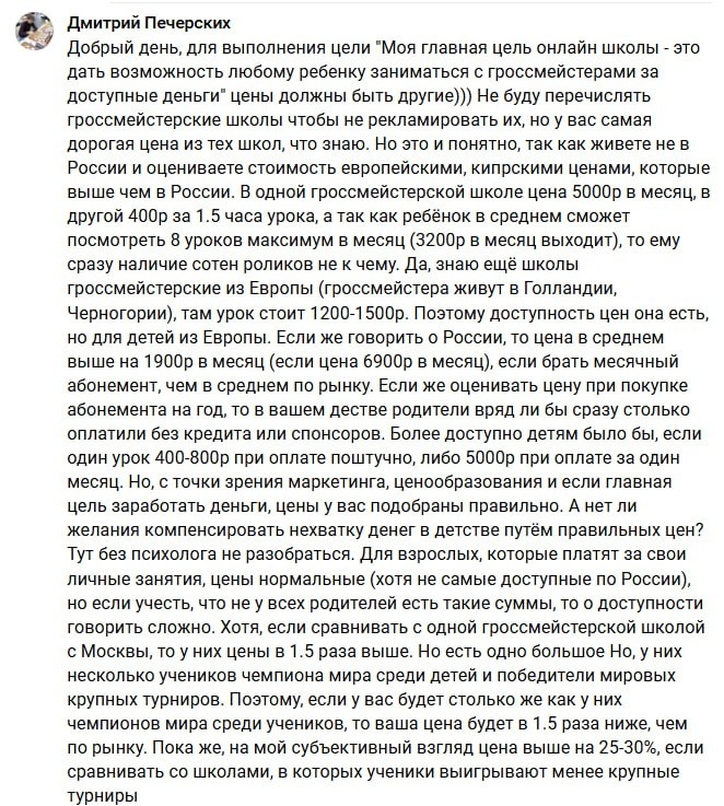 Получила такой комментарий)) 👆 Говорят, что у меня дорогая школа. Давайте сравнивать. У нас стоимость обучения от 4.993 руб. в месяц. Сюда входит: ✅ 25 онлайн уроков в месяц ✅ Анализ партий и составление рекомендации. Это файл на 25-30 листов с описанием стиля игры ученика, примерами его ошибок и индивидуальной программой дополнительных уроков и курсов из нашей Базы знаний. Мы единственная школа, которая делает такие рекомендации ученикам. ✅ Конкурсы решения задач с призовым фондом 120.000 руб. ✅ Консультации со спортивным психологом ✅ Консультации со спортивным врачом ✅ База знаний с 3500 уроков, лекций и курсов от гроссмейстеров. ✅ Возможность выиграть поездку на чемпионат мира за счет нашей школы. ✅ Беспатное обучение в школе за победы на турнирах, выполнение разрядов. ✅ Сеансы одновременной игры с гроссмейстерами. И это все 5000 руб. в месяц. Уверенны, что у нас дорогие занятия?