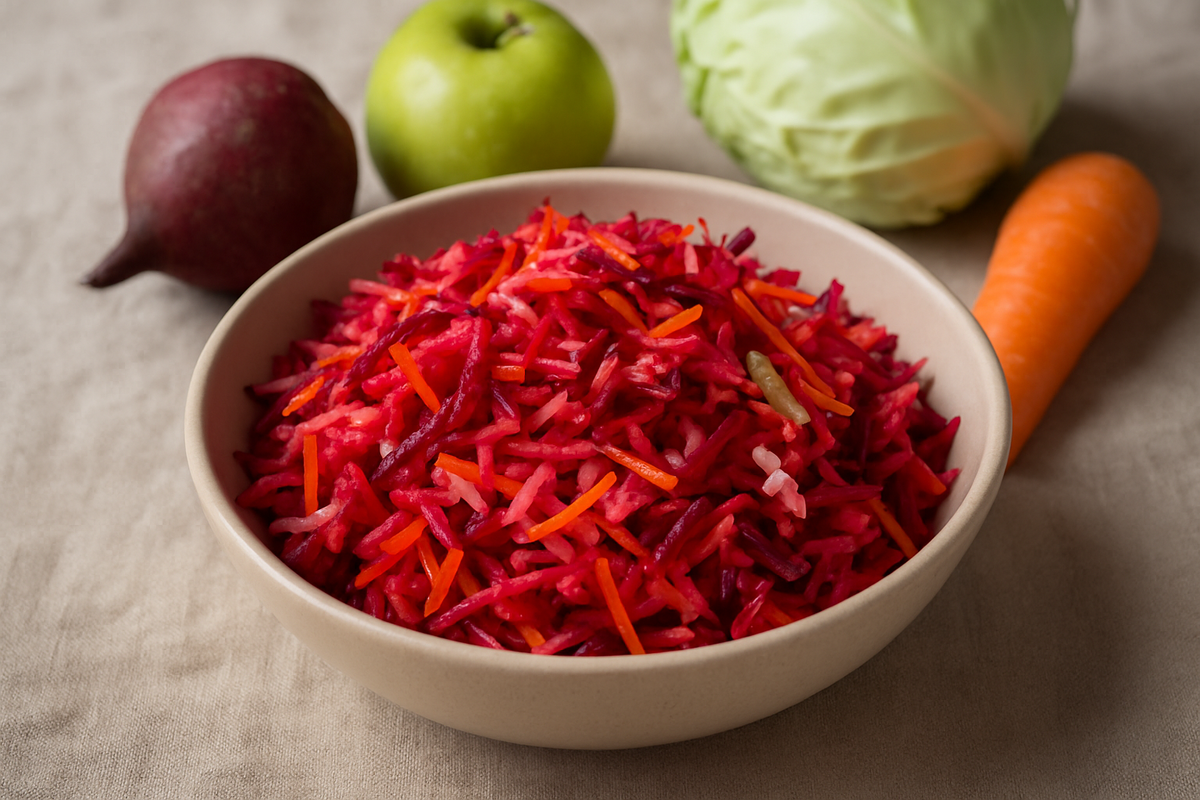 Салат "Метелка" — это не только вкусное, но и полезное блюдо. Все ингредиенты этого салата, такие как свекла, морковь и капуста, богаты клетчаткой, витаминами и минералами, которые способствуют улучшению пищеварения и детоксикации организма. Такой салат станет отличным дополнением к любому рациону, обеспечивая легкость и свежесть. Время приготовления: 15 минут
