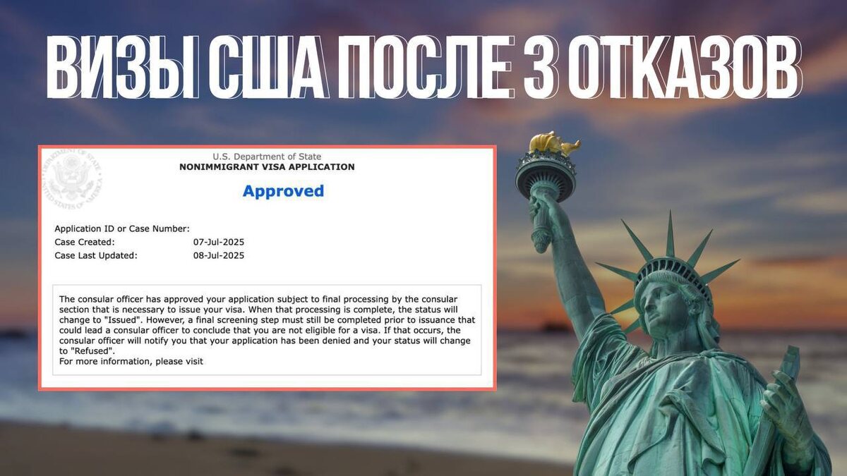 Виза США после 3 отказов 🇺🇸 8 июля: одобрена повторная туристическая виза в США гражданке РФ после 3-х отказов. Кейс: женщина, состоит в гражданском браке и работает кассиром. В США проживает дочь, гражданка Америки, запланирована поездка к ней. Было 3 отказа в визе в 2025 году. За последние 5 лет было посещено 5 стран. Собеседование проходило на английском с переводчиком. Вопросы консула: — Какая цель вашей поездки? — Сколько раз подавались на визу США? — Сколько раз получали отказ? — Что изменилось с прошлого раза? — На что расчитываете при новой подаче? После ответов на вопросы консул одобрил визу США! 🇺🇸 Получить визу США ⬅️ Записаться на консультацию ⬅️ #кейс #виза_сша #виза_после_отказа