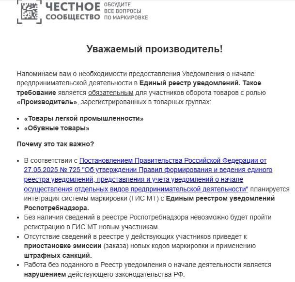 ‼️ По поводу рассылки от Честного ЗНАКа и ⚖️ Постановление № 725, вступающее в силу с 1 сентября 2025 года Долго пытался разобраться в ситуации — информации много, мнения специалистов разных ведомств расходятся. Вот наиболее корректное и понятное объяснение Постановления № 725, которым хочу с вами поделиться 👇 🧾 Что это такое? С 1 сентября 2025 года вступает в силу Постановление Правительства РФ № 725 от 27.05.2025, которое вводит новые правила подачи уведомлений о начале определённых видов предпринимательской деятельности. 📌 Это постановление касается всех, кто работает с маркировкой, и особенно тех, кто указал себя в Честном ЗНАКе как «производитель». Именно такие пользователи получили рассылку от ЧЗ. Ранее мы уже обсуждали, что государство разрабатывает регламенты и автоматические механизмы выявления псевдопроизводств — компаний, которые указывают себя производителями, но фактически ими не являются. 📌 Постановление № 725 — один из инструментов обеления рынка. Если вы заявили