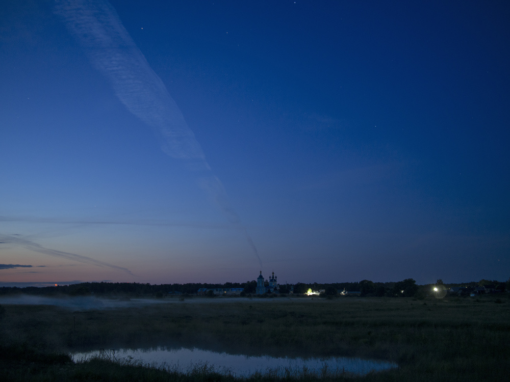 Месяц июнь - пора не только белых ночей, но и серебристых облаков. Это самые высокие облака в атмосфере Земли, расположенные на высоте от 76 до 85 км. Они состоят из кристаллов льда и с Земли видны только во время астрономических сумерек, т.е. после захода солнца или перед восходом. Эти облака наблюдаются преимущественно в самые короткие ночи в высоких широтах в Северном полушарии. Они видны только тогда, когда наблюдатель и нижние слои атмосферы находятся в тени Земли, но в то же время эти очень высокие облака все еще освещаются солнечным светом. Кристаллы льда рассеивают солнечный свет, что визуально воспринимается как свечение на темном небе. До этого момента я еще ни разу не пытался увидеть серебристые облака. И вот в одну ясную июньскую ночь выехал в надежде ими полюбоваться. Но уже по дороге было понятно, что этой ночью серебристые облака отдыхают и светиться не желают. Но не возвращаться же было назад. Приехал около часа ночи в Дунилово, занял свою смотровую площадку, с которой