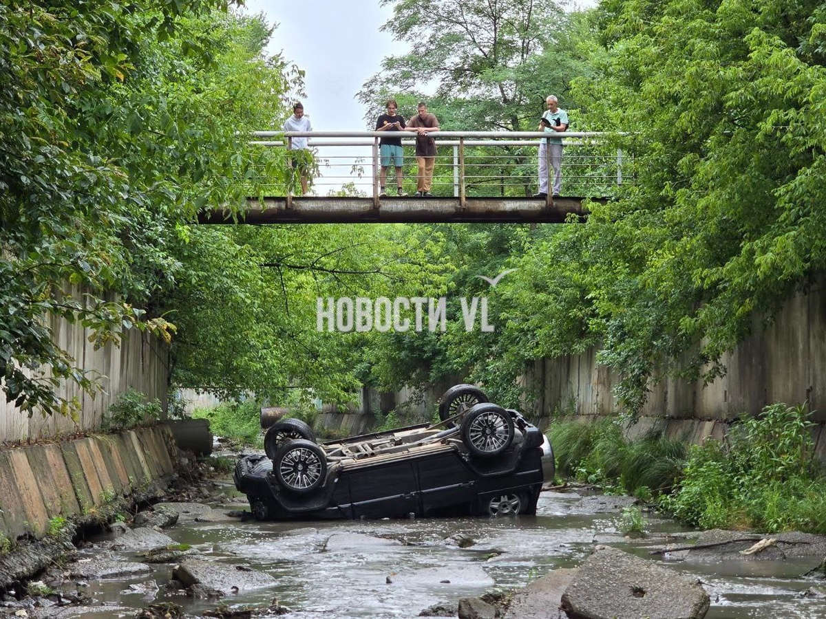 Во Владивостоке в районе Бородинской Гелик кувыркнулся с косогора в реку.