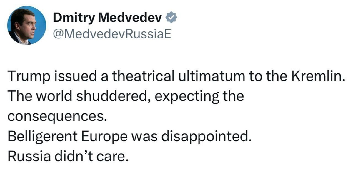 Дмитрий Медведев написал, что Россию не волнует "театральный" ультиматум Трампа.