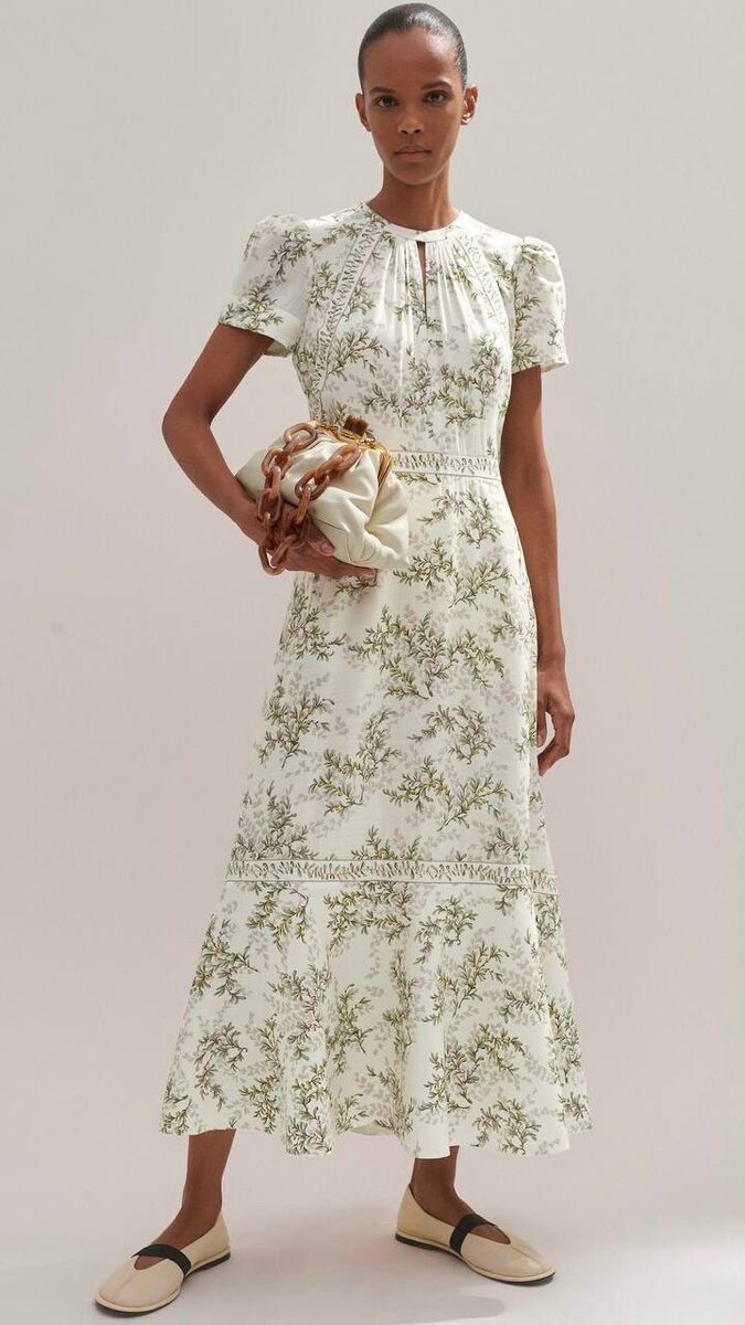 Плательно-блузочный лен с зеленым флористическим принтом на молочном фоне
