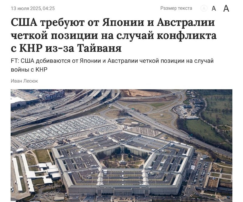 🇺🇸🇯🇵🇦🇺 Пентагон требует ясности от союзников по Тайваню. По данным Financial Times, Вашингтон настаивает, чтобы Япония и Австралия четко определили свою роль на случай конфликта США и Китая из-за Тайваня. ⚔️ Минобороны США добивается от Токио и Канберры не только обязательств, но и увеличения оборонных расходов на фоне растущих угроз от КНР. Сообщается, что власти этих стран недоумевают из-за таких требований. 🤔 °Telegram • Zen • Bastyon° ✒️Предложить новость