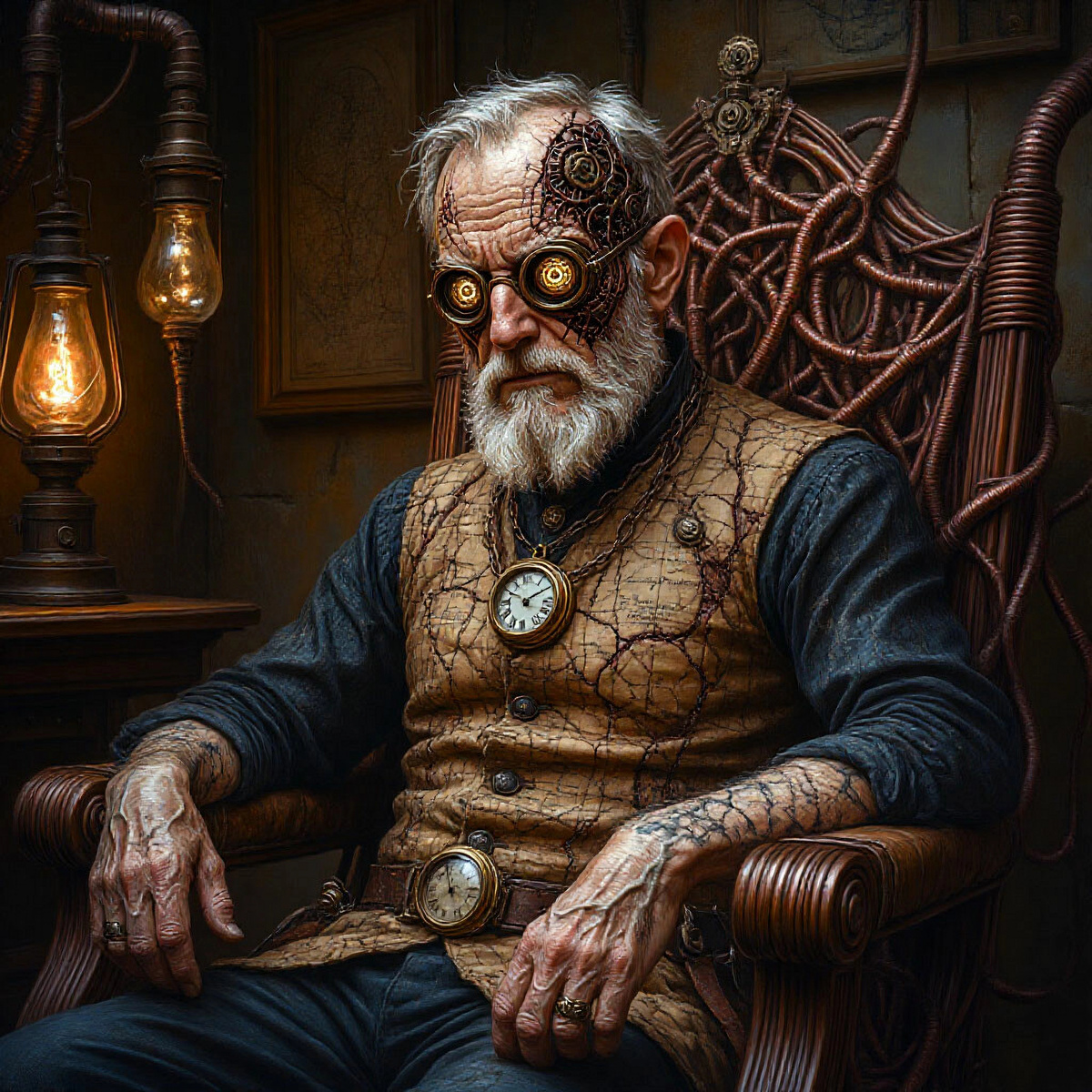 В самом центре этого механизированного ада, на троне из переплетённых трубок и медных кабелей, сидел он. Мастер Тибериус. Он почти не изменился. Древний старик с пергаментной кожей, натянутой на острые скулы. Лишь его глаза были другими. Вместо зрачков в них медленно вращались крошечные, замысловатые шестерёнки. Его собственное тело было его первым шедевром.
