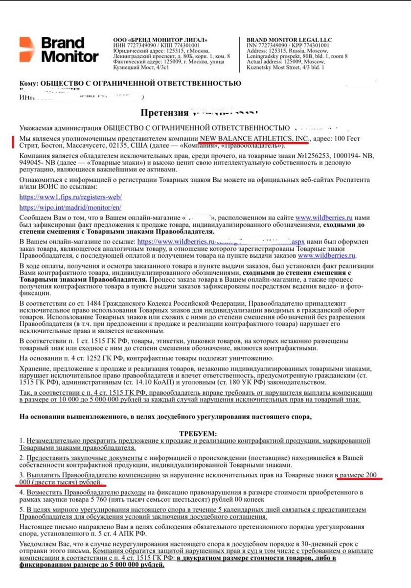 Китайский New balance на Wildberries — минус 200 000 ₽. Как не надо делать. Продавец работал на Авито. Решил «расшириться» — отгрузил на ВБ свои New Balance. Документов — ноль. Оригинальности — тоже. Китайская копия, контрафакт. Через неделю прилетела претензия от официального представителя бренда: 🔹 требование снять с продажи, 🔹 уничтожить товар с видеофиксацией, 🔹 компенсация — 200 000 ₽ в досудебке. ⚠️ А по закону штраф может быть до 5 миллионов. 💡Мораль: Неважно, что кто-то «так делает». ВБ — не Авито. Тут всё фиксируется, проверяется, и каждый продавец несёт персональную ответственность. Сначала — изучаем законодательство, читаем оферту, понимаем риски. Потом — анализируем рынок. И только потом — отгружаем. Не наоборот.