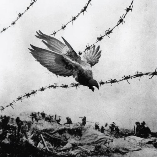 Focus on the bird's determination amidst chaos. Великое спасение в воздухе: история голубя-солдата Октябрь 1918-го. Аргоннский лес экранировал отряд майора Уиттлси — 194 человека, отрезанных от своих. Последний шанс — почтовый голубь Шер Ами. Под шквальным огнём птица взмыла в небо, хотя пуля перебила лапу и выбила глаз. За 25 миль адского пути, истекая кровью, он доставил записку с координатами. Бойцы спасены, а Шер Ами получил Военный крест Франции. Эта птица вынесла не победу, а жизни — бесшумный подвиг крылатой отваги.