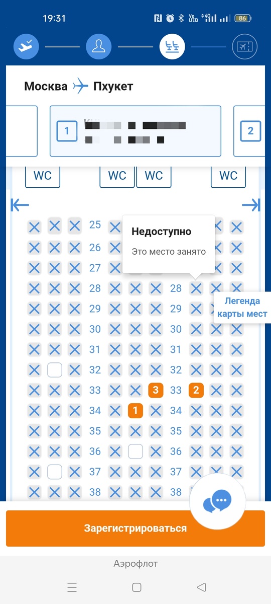 Пришлось выбрать напротив два места (через проход) . И одно сзади. Моё оказалось сзади, так мне всегда везет на рандомное распределение.