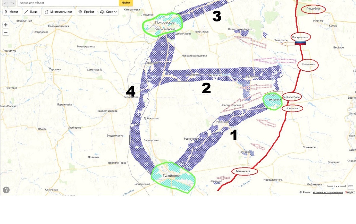 На данном участке фронта можно выделить четыре основных рубежа обороны ВСУ, они пронумерованы. Напрашивается удар на Январское и Темировку , что создаст двусторонний охват полос обороны №2 и №3 . Вписывается в задачу построения буфера, если что, так №2 расположена вдоль границы Днепропетровской области. Данную схему наступления и разгрома мощных оборонительных систем противника мы использовали уже неоднократно, просто не в таких масштабах.