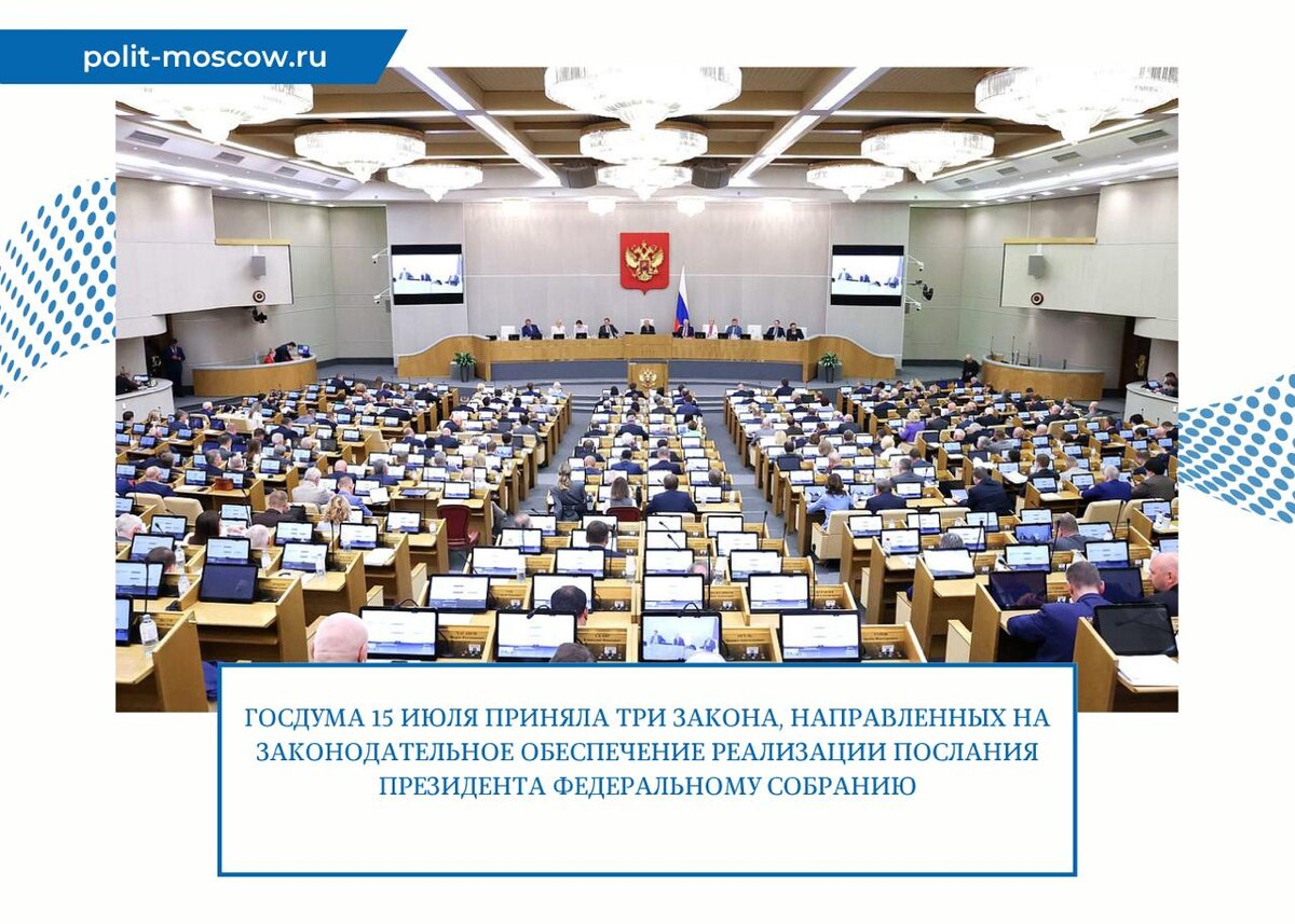 🇷🇺Госдума 15 июля приняла три закона, направленных на законодательное обеспечение реализации Послания Президента Федеральному Собранию